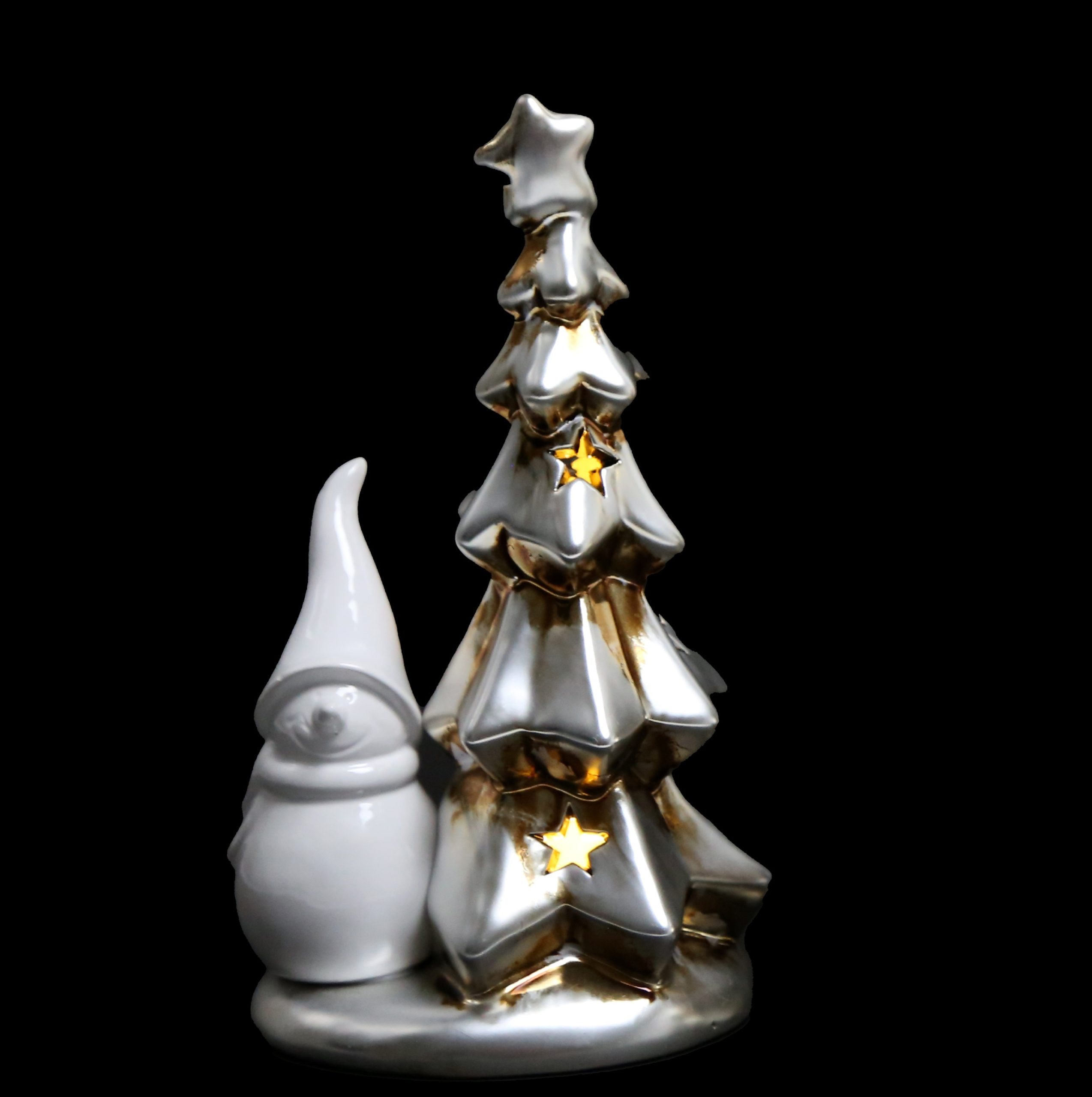 This LED decoration features a cheerful snowman design adorned with a festive scarf and hat, complemented by a shimmering silver tree. The built-in LED lights create a warm, inviting glow, perfect for adding a whimsical touch to any setting.