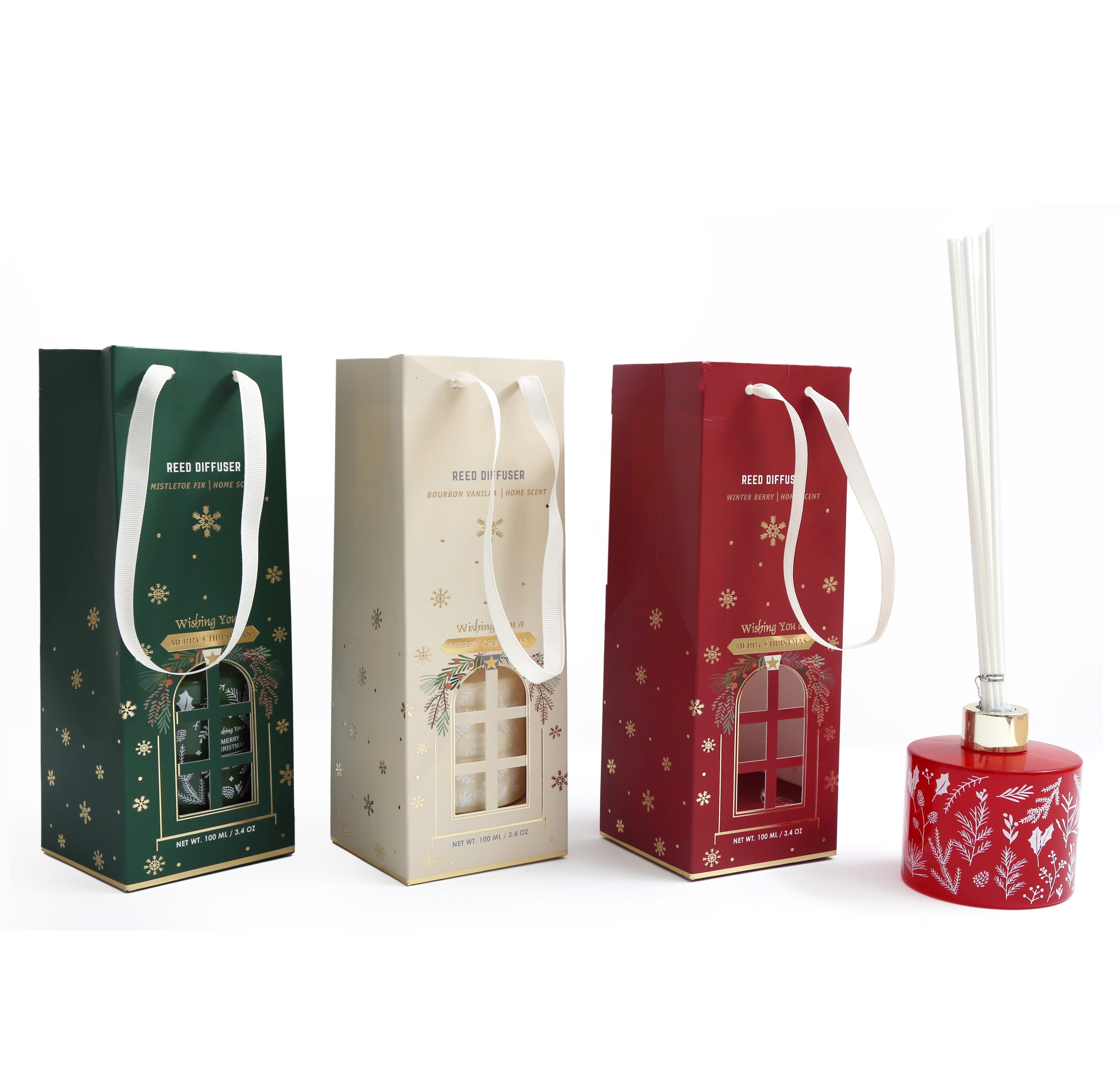 This Christmas diffuser set comes in a festive gift bag, with three delightful holiday scents available: Mistletoe and Fir (green), winter berry (red), or Vanilla Spice (ivory). Each diffuser provides a seasonal fragrance that fills your space with warmth and holiday spirit, making it the perfect gift for spreading festive cheer.
