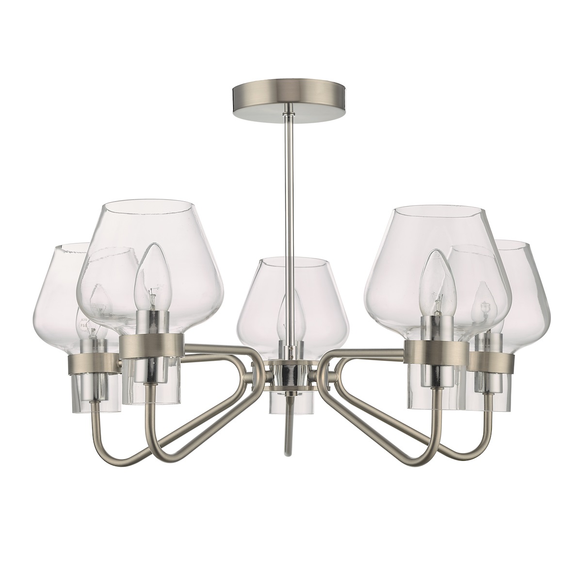 The Kempston 5 light pendant is a semi flush ceiling light featuring glass shades with a retro look resting on a complementing satin chrome frame and glass.